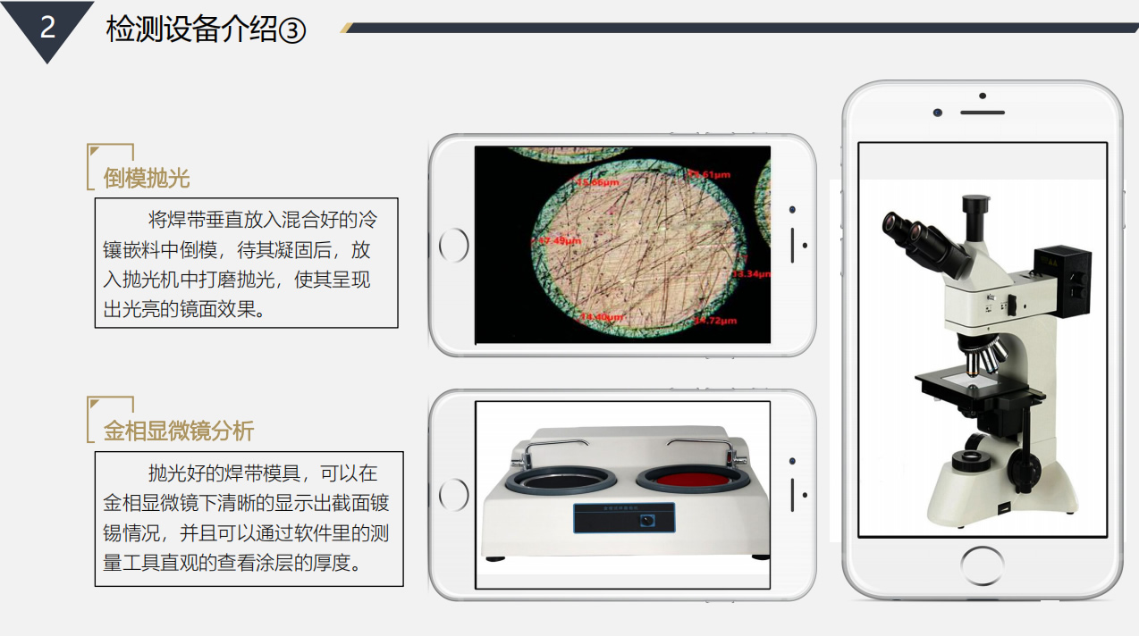 金相顯微鏡分析:拋光好的焊帶模具,可以在金相顯微鏡下清晰的顯示出截面鍍錫情況,并且可以通過軟件里的測量工具直觀的查看涂層的厚度。